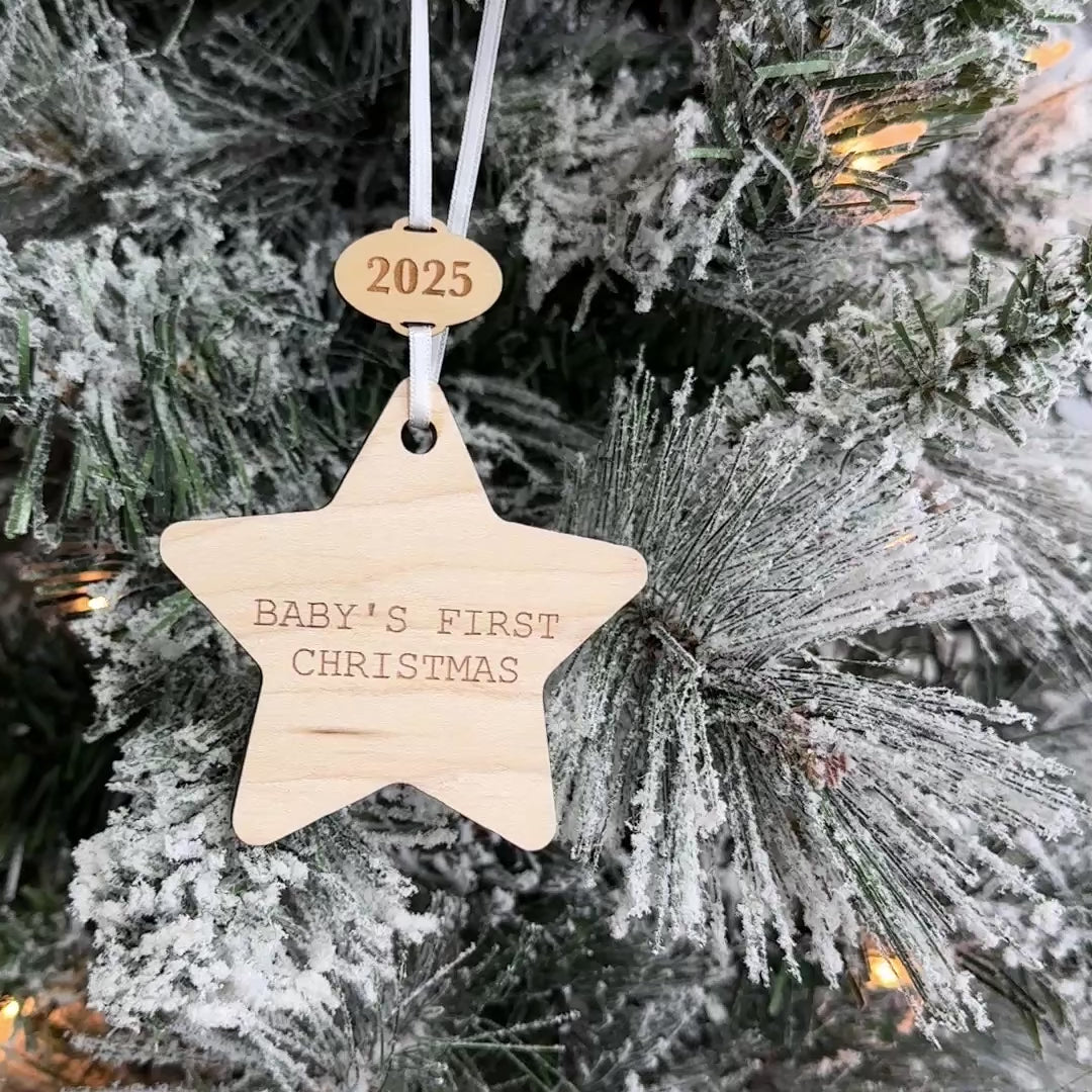 Single-layer wood star ornament engraved with Baby’s First Christmas