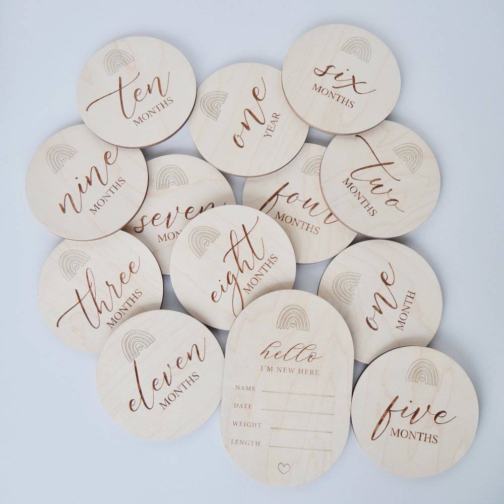 This beautiful announcement & milestone set is made from maple & has space to write in the Date/Time/Weight/Length of your new little one. Complete it with a set of monthly milestone photo markers, one for each of their first 12 months.ย