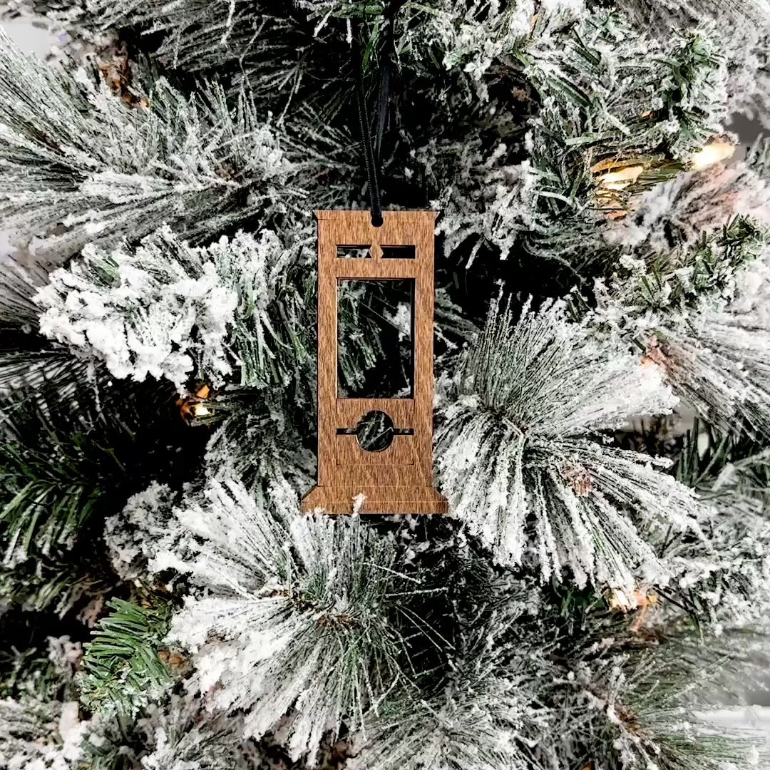 Your Guillotine Ornament is handcrafted in our Saskatchewan studio from clear acrylic and Canadian harvested wood. Each one is layered to create dimensional detail, finished with a dark stain.