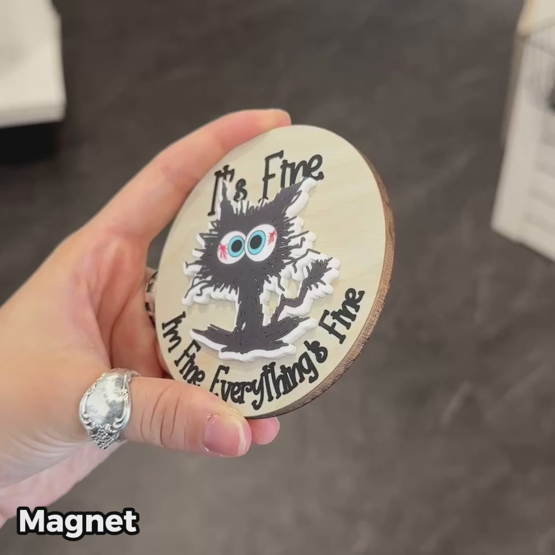 Not to worry, this sign is bound to put a smile on your face. This beautiful blue stained round sign features a frazzled cat crafted out of layered wood with the words "It's Fine I'm Fine Everything's Fine" written around it.