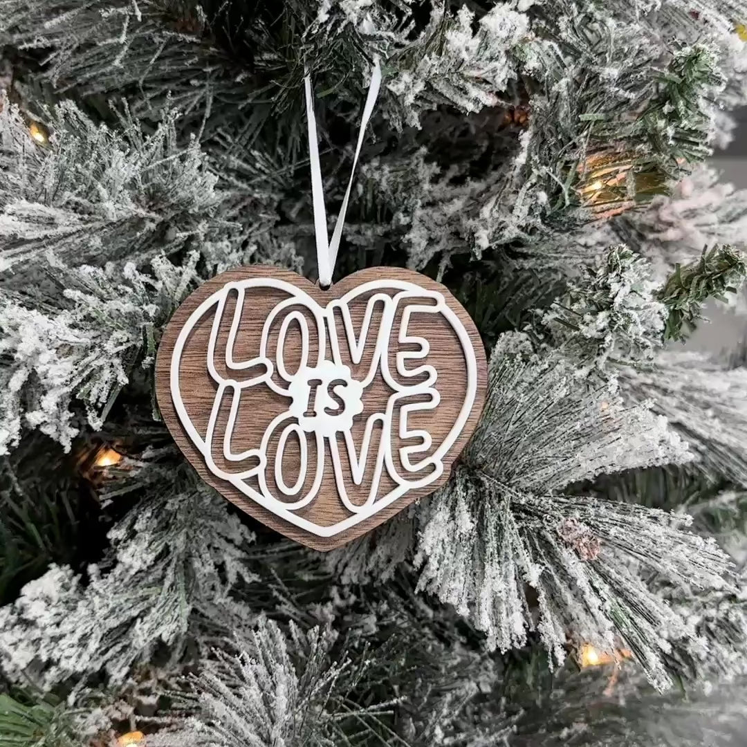 Celebrate love in all its forms with this pretty layered ornament featuring the words "Love is Love" -- a timeless message of inclusivity and acceptance. Crafted from premium wood and a frosted white acrylic, this ornament carries a simple yet powerful message, honouring the love that knows no boundaries. Designed with care by Sticks & Doodles in Regina, Saskatchewan, it's a cherished addition to your holiday pride decor, symbolizing the universal bond that unites us all.