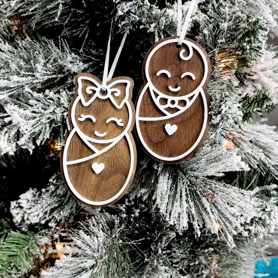 Celebrate the joy of parenthood and the arrival of your little bundle of joy with this layered beauty! Choose between the wood baby with a sweet bow and the other without, capturing the precious moments of your baby's first holiday season! Makes a great gift for someone expecting!