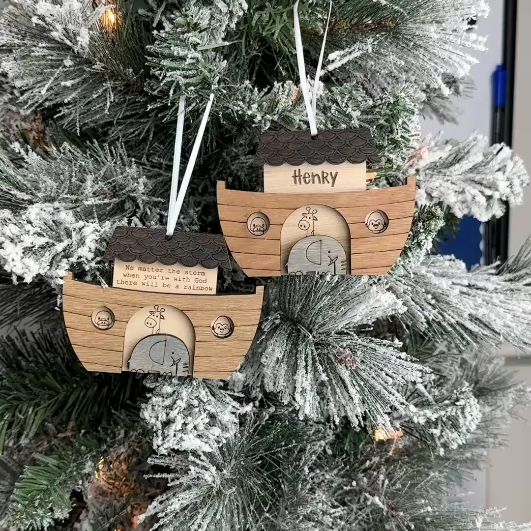 This charming ornament captures the heart of Noah’s story — a tiny wooden ark with layered details and little critters peeking through the ship windows.