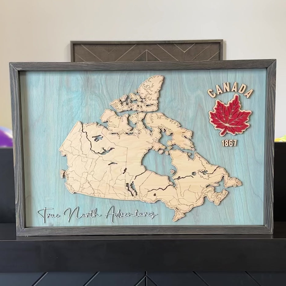 Each Canada map is handcrafted in our Regina, Saskatchewan workshop, using layered wood cutouts and engraved details to bring the landscape to life. Personalize it with your choice of colours and wording, then mark off the provinces, territories, or favourite towns you've explored to create a display as unique as your journey.