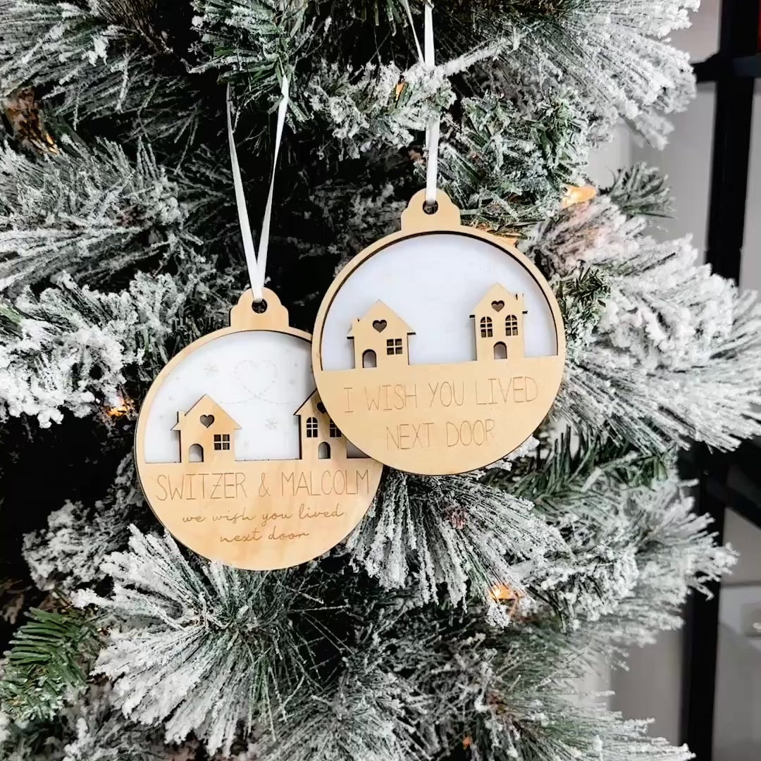 Bridge the distance and celebrate a cherished friendship with the "Wish You Lived Next Door" ornament -- a symbol of the enduring bonds that know no distance. This beautifully crafted ornament features a layer of tiny wood houses layered on top of a frosted acrylic backer. Each house is adorned with intricately cut windows and a little connecting heart between, symbolizing the homes and hearts that are connected even when miles apart. Personalize yours with names